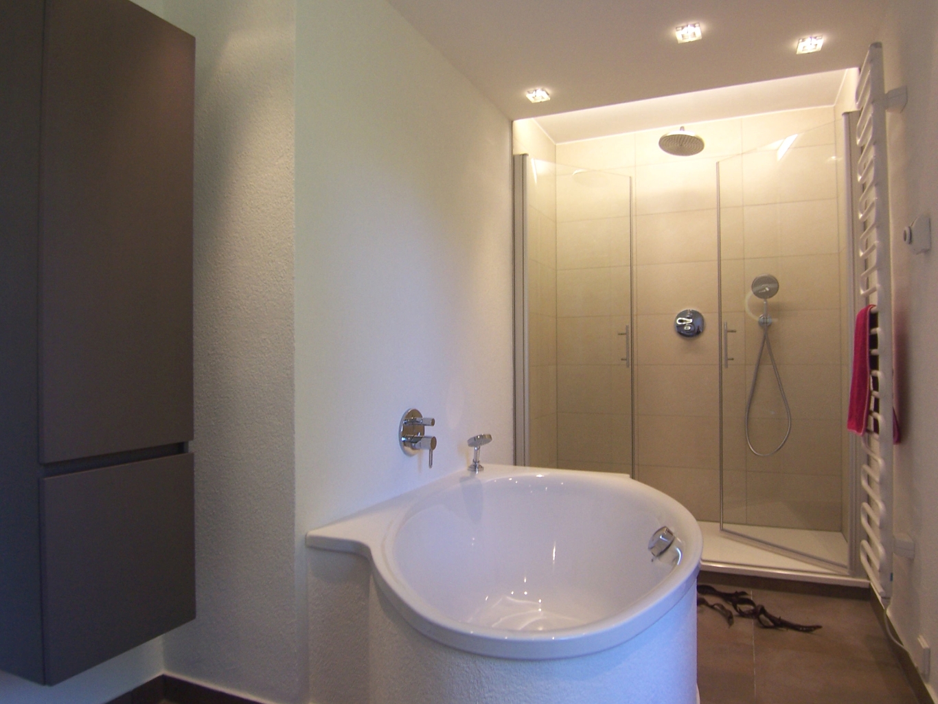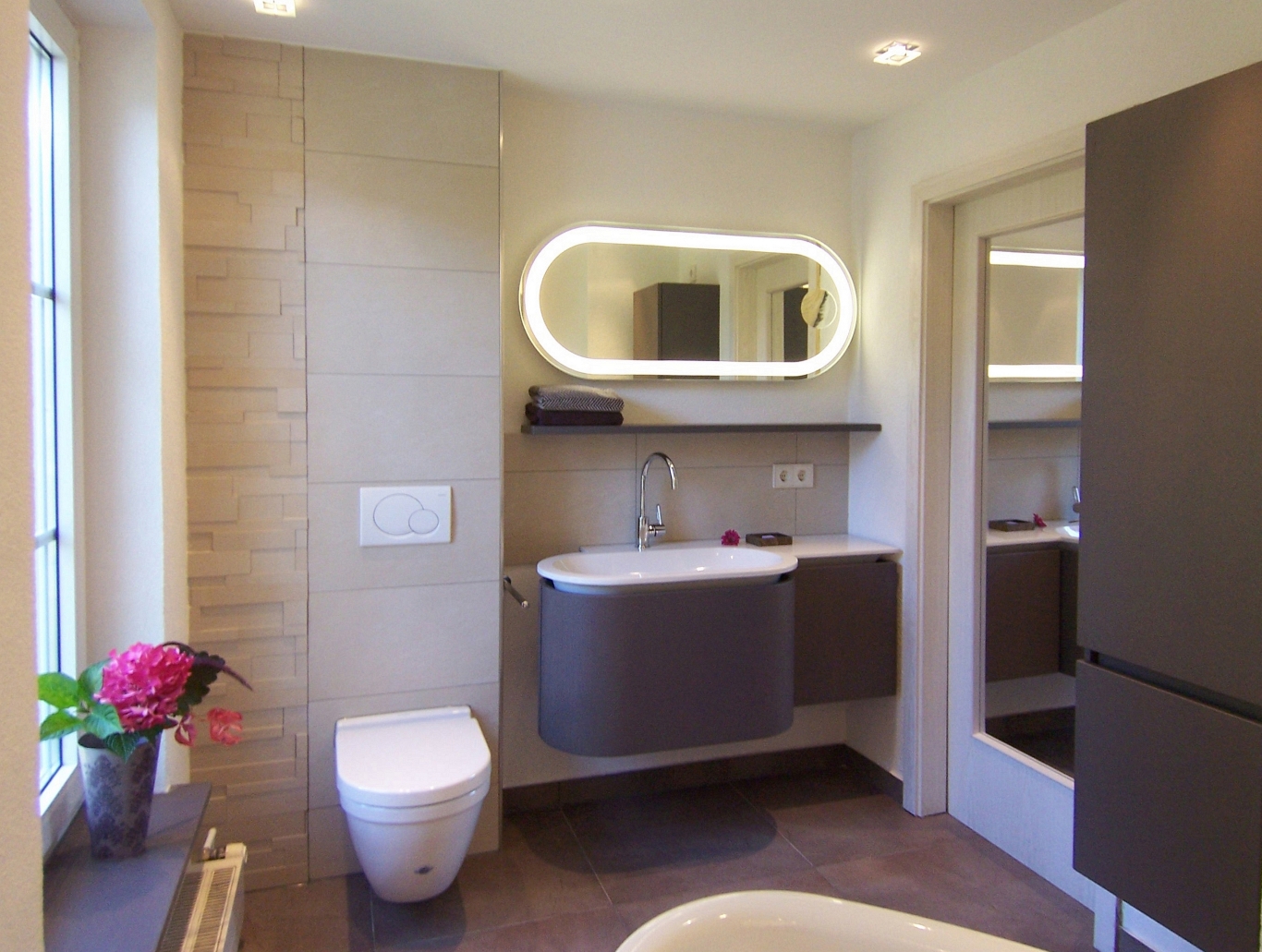 Das gute Beleuchtungskonzept lässt nicht nur die eindrucksvolle Duschnische von Hüppe und HSK erstrahlen - es setzt auch am eleganten Waschtischmöbel von Burgbad Akzente.