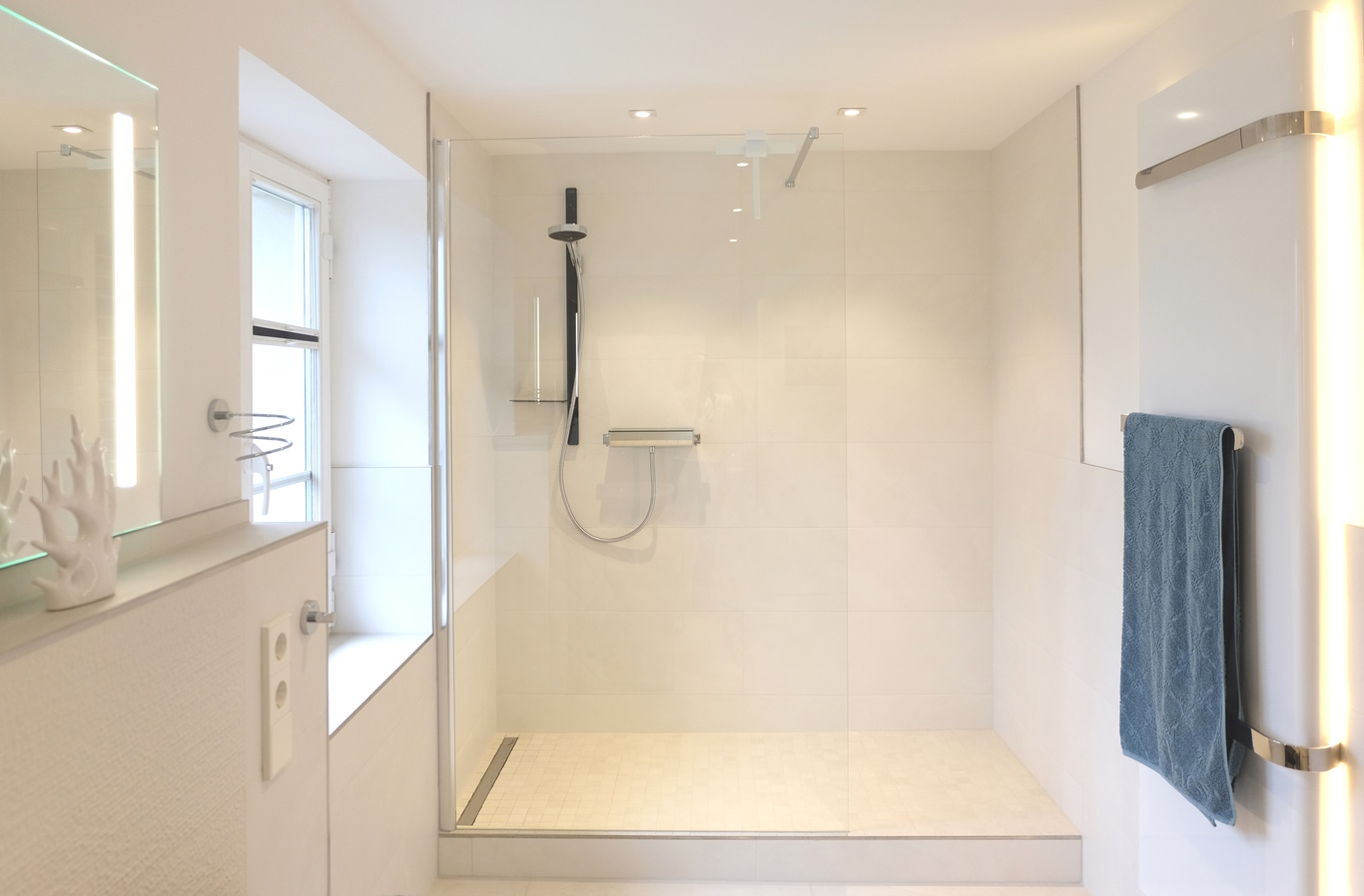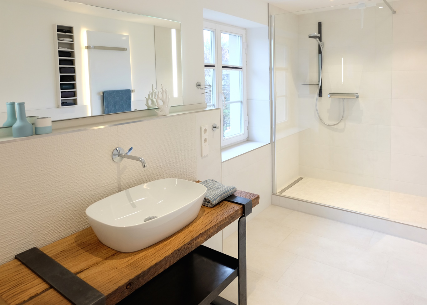 Gegenüber strahlt die schöne Design-Heizwand von Bemm vor verdeckter Lichtquelle. Die Eigentümer haben auf die Badewanne verzichtet und dafür den Duschraum öffnen und vergrößern lassen – zugunsten von Freiraum und Weite. Die Trendfarbe schwarz setzt zurückhaltend Akzente.
