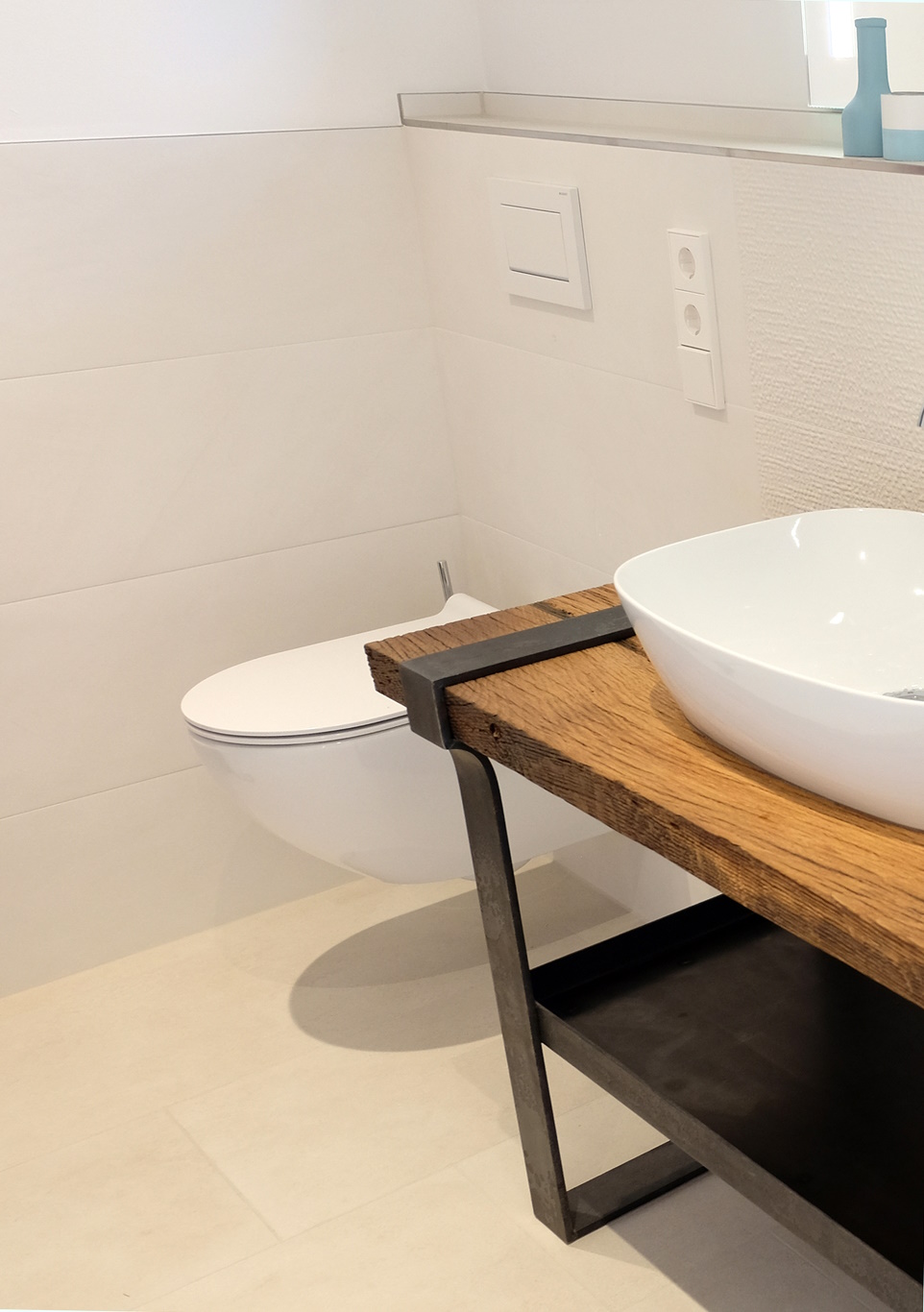 Den Mittelpunkt im sonst modernen, klaren und pflegeleichten Bad verkörpert der schwere Waschtisch mit massiver Eichenplatte und schwarzem Metallgestell vom Tischler mit filigranem Waschtisch und reduzierter Armaturenvariante.