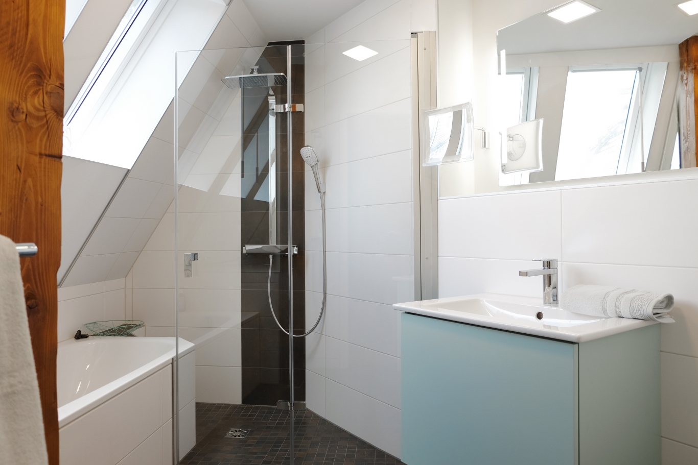 Die stufenlos begehbare Duschfläche begrenzt nur teilweise eine faltbar-flexible Maß-Duschabtrennung von Hüppe in die Dachschräge hinein.