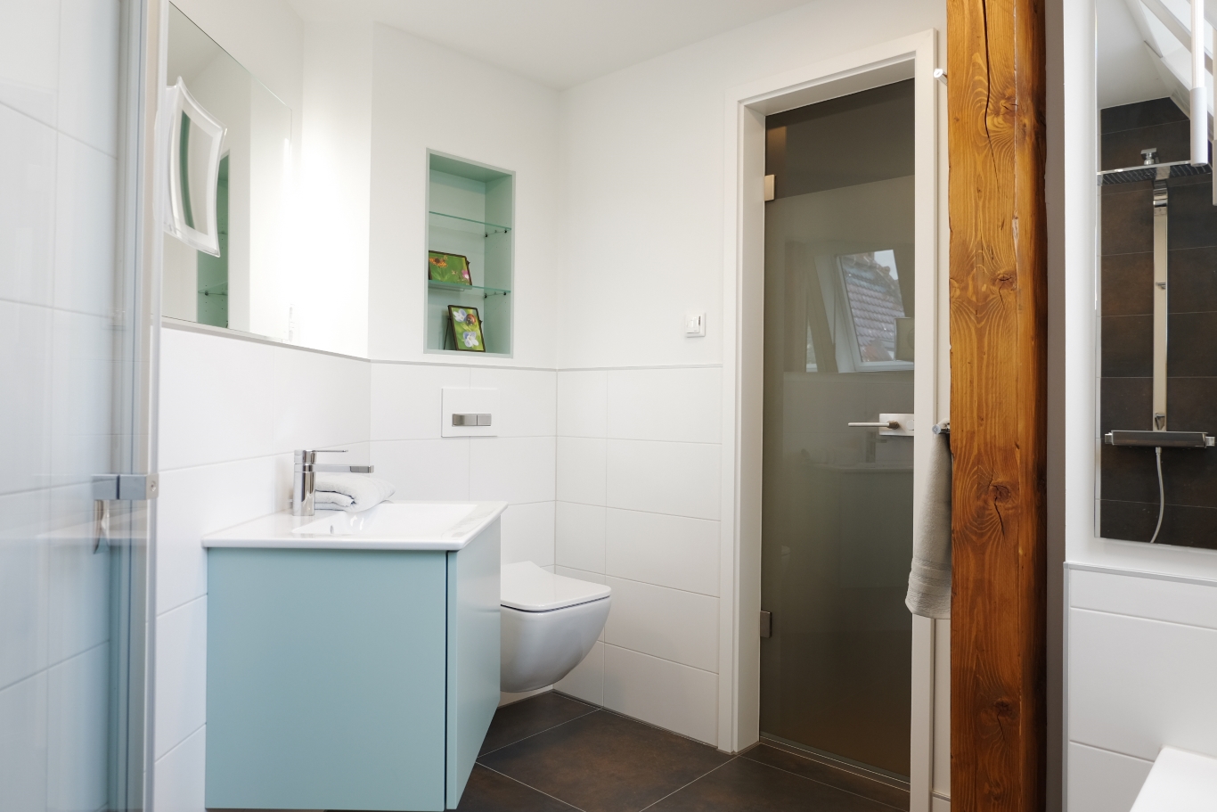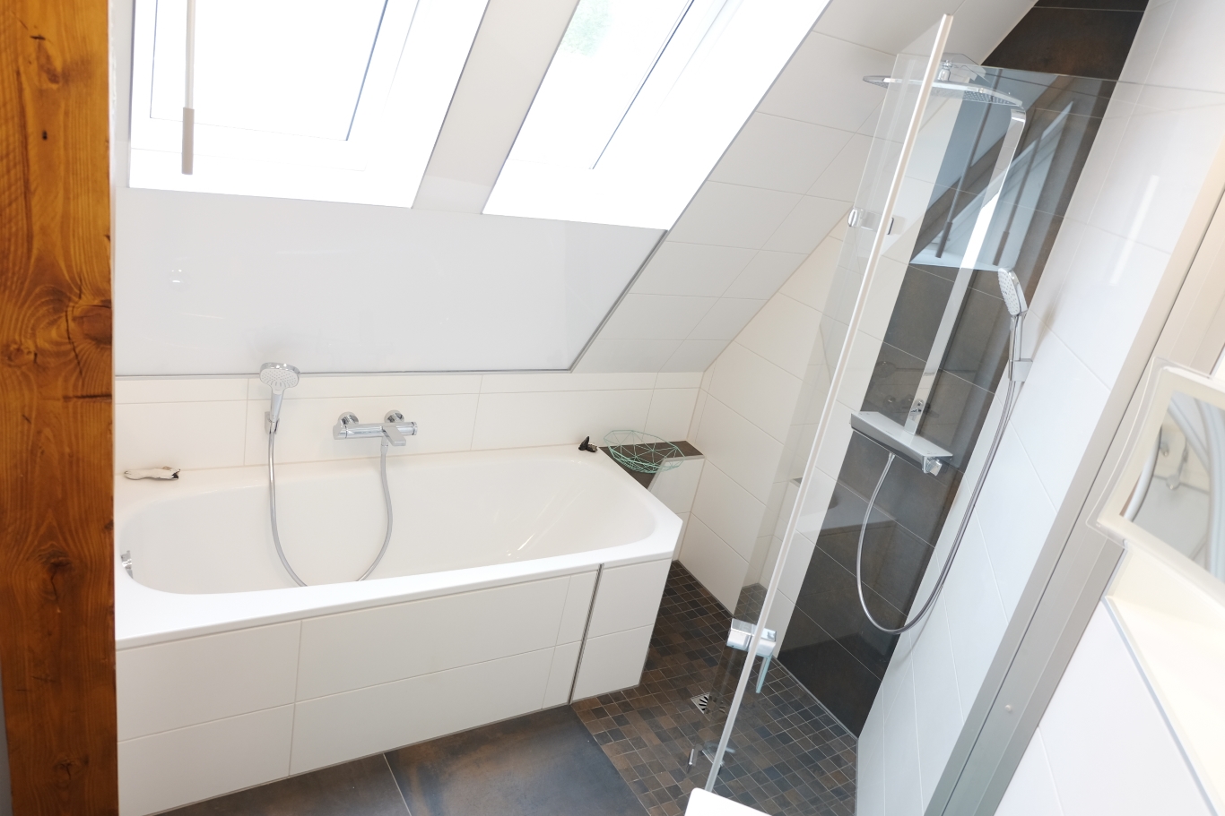 2 Dachfenster, eine Glastür und 3 neue Lichtquellen später und das etwas zu dunkle und zu üppig geflieste Nachwende-Bad im schönen Elbufer-Altbau erstrahlt.