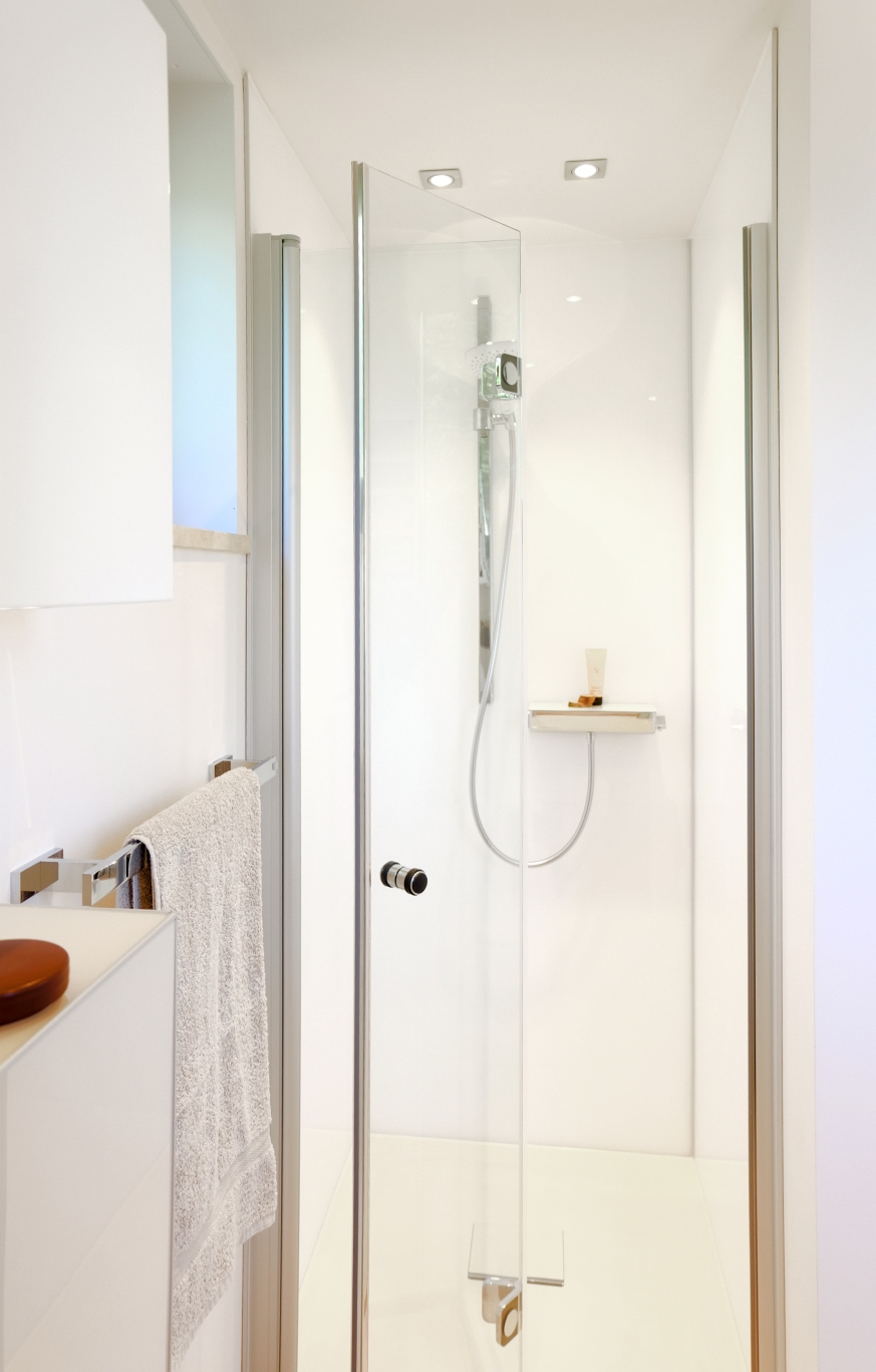 Großformatiges helles Plattenmaterial an den Wänden weitet den Raum und lässt ihn allseits verjüngt erstrahlen.
